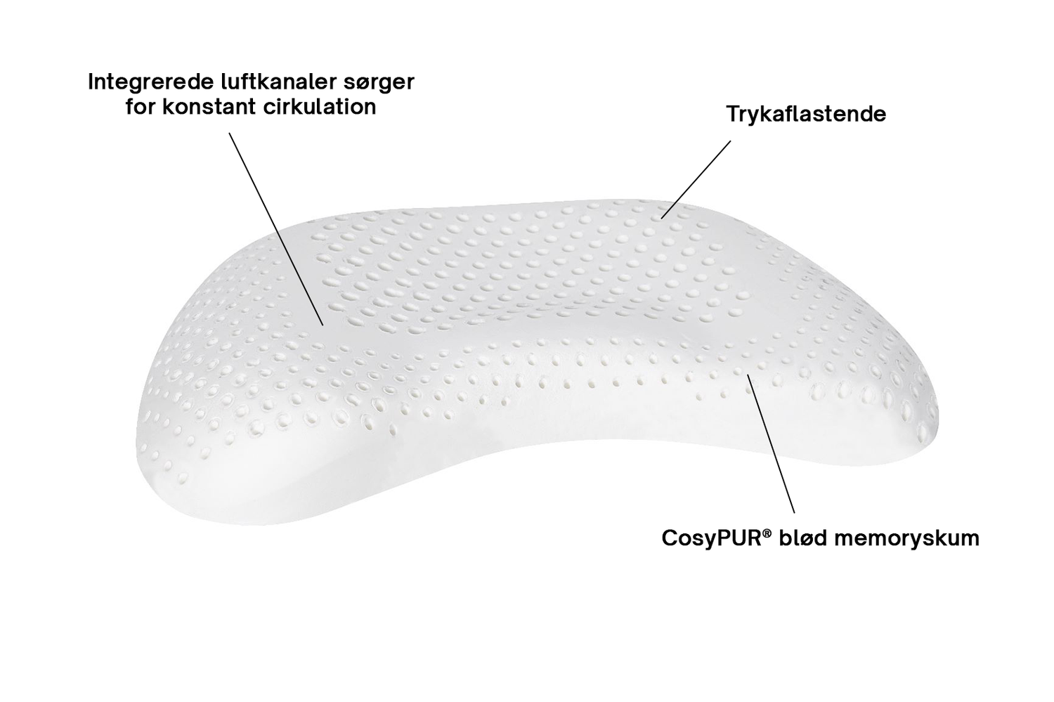 Den måneformede pude er fremstillet af blødt og trykaflastende CosyPUR® skum. Den hule midte af puden giver dig en behagelig hovedstøtte og solid støtte til nakke og skuldre.